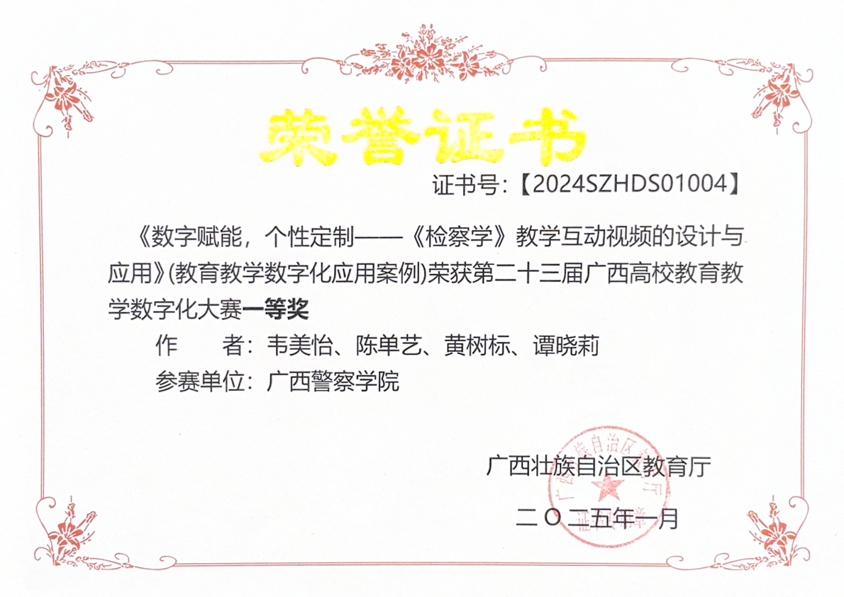数字化转型实现跨越。学院与山东政法学院、新疆政法学院构建深度协同机制,创新打造三校“云课堂”教学模式,形成跨地域教学共同体。大力推进现代信息技术与传统课堂融合,自主研发包括监狱执法、应急处突等场景在内的10余项虚拟仿真实验系统,实现教学手段的智能化升级。教师在广西高校教育教学数字化大赛中斩获一等奖1项、二等奖2项、三等奖3项,数字化教学能力实现整体提升,智慧教学新生态逐步形成。